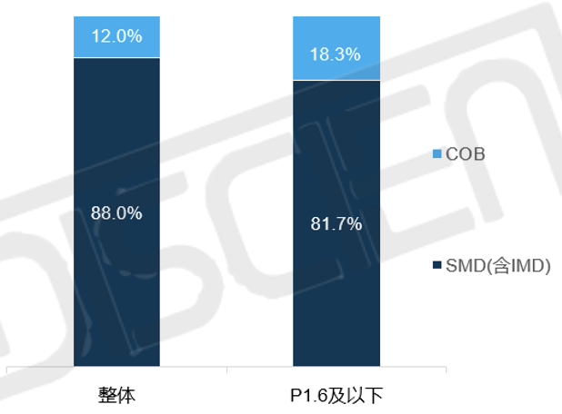 1、分封裝技術(shù)看,P1.6及以下市場COB占比明顯更高,銷額份額已超18%;在整體LED小間距市場中一季度COB占比12%,份額同比增長2個(gè)百分點(diǎn),但如果重點(diǎn)看P1.6及以下市場中,COB占比已達(dá)18.3%,份額同比增長4.9個(gè)百分點(diǎn),主力為指揮調(diào)度中心、大數(shù)據(jù)中心、政府會(huì)議室等場景滲透應(yīng)用持續(xù)增加;可見隨著間距的下沉,COB成本優(yōu)勢逐漸凸顯,同時(shí)隨著參與品牌的增多,市場對(duì)COB的認(rèn)知度持續(xù)提升;另一方面也反映在COB市場中,間距微縮化進(jìn)程更快,更小間距需求度更高。